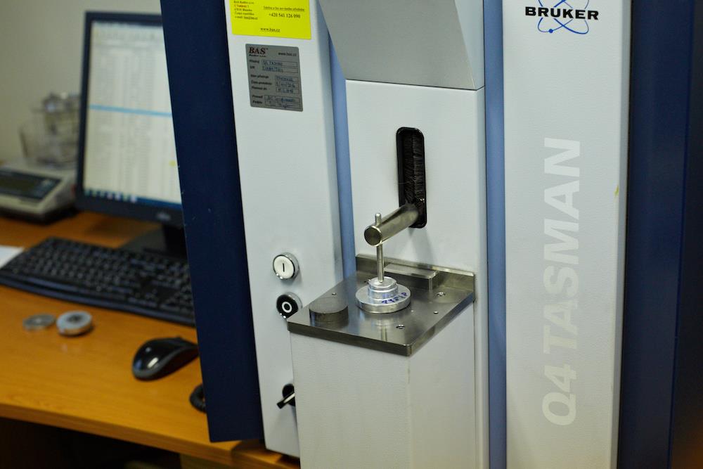 Vor dem eigentlichen Gießen kontrollieren wir den sog. D-index (Begasung des Materials) und die Gießtemperatur. Die Temperatur des Gussmaterials einer Aluminiumlegierung liegt bei etwa 740 °C. Die genaue chemische Zusammensetzung des Gussmaterials erfassen wir mithilfe des optischen Emissionsspektrometers Q4 TASMAN.